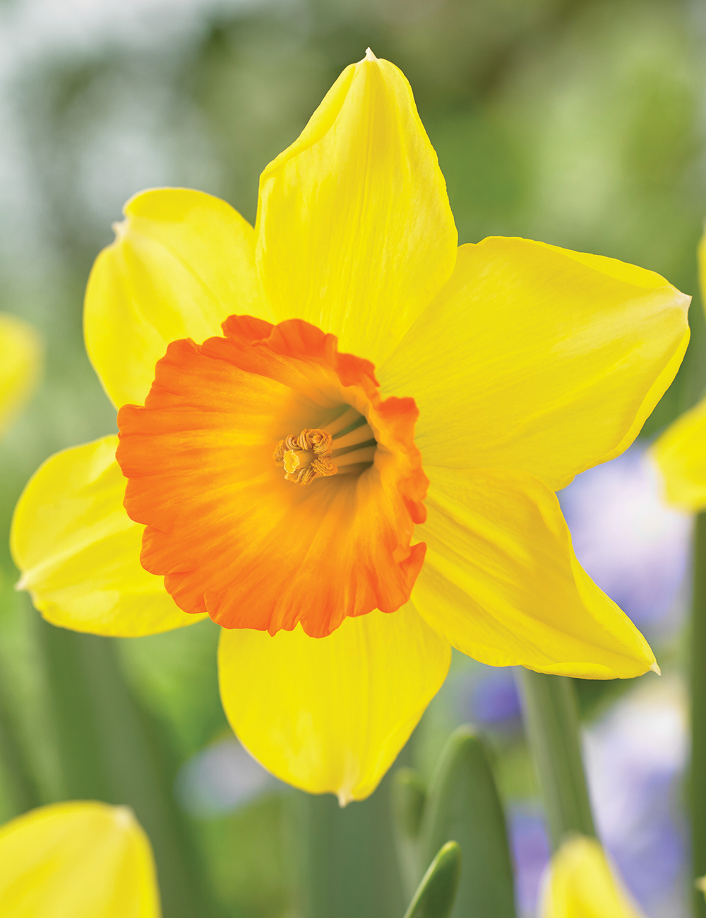 Bright yellow, slightly reflexed petals with a wide, open and frilled corona with a bold orange edge that softens towards the base. The petals have excellent substance, standing up to the weather and lasting well. Opens early to mid season.
