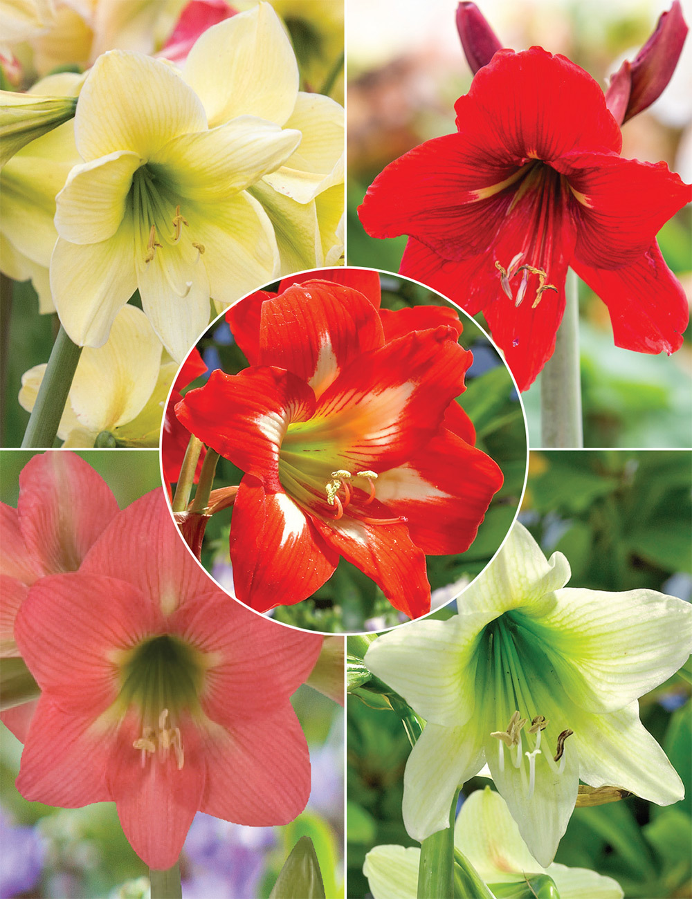 Receive one of each variety, separately labelled. Sonatini Hippeastrum Collection includes ‘Lemon Sorbet’, ‘Bright Spark’, ‘Green Shades’, ‘Amico’ and ‘Belladonna’.