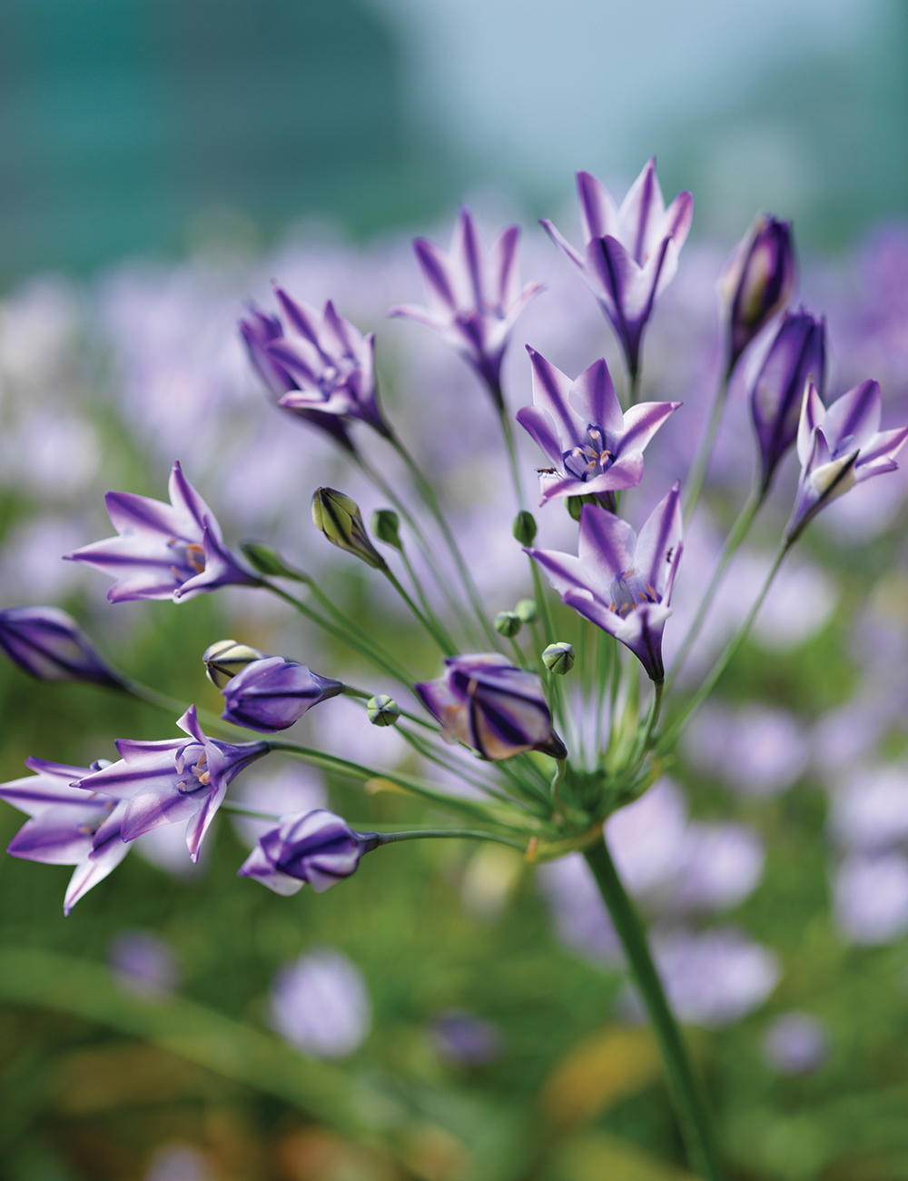 Up to 25, soft to deep purple flowers open in loose clusters. The butterflies and bees love them. They bloom after the upright, narrow foliage, which soon disappears as the floral show begins. After flowering they go dormant through the hot months of summer.